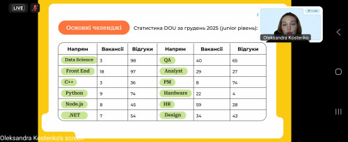 19 січня 2026 року студенти освітньої програми «Комп’ютерні науки» долучилися до онлайн-заходу «Кар’єра в IT без програмування: як почати у 2026 році?» Lead Generation та IT-продажі — це напрям, який для багатьох стає першою сходинкою в тех-індустрії. Тут важливі комунікаційні навички, аналітичне мислення та розуміння бізнес-процесів, а не знання мов програмування.