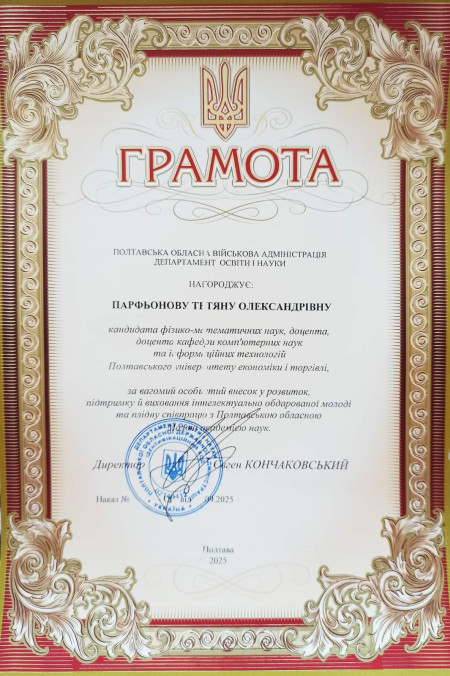 Щиро вітаємо Парфьонову Тетяну, викладачку кафедри комп’ютерних наук та інформаційних технологій з отриманням відзнаки Полтавської обласної військової адміністрації та Департаменту освіти і науки.